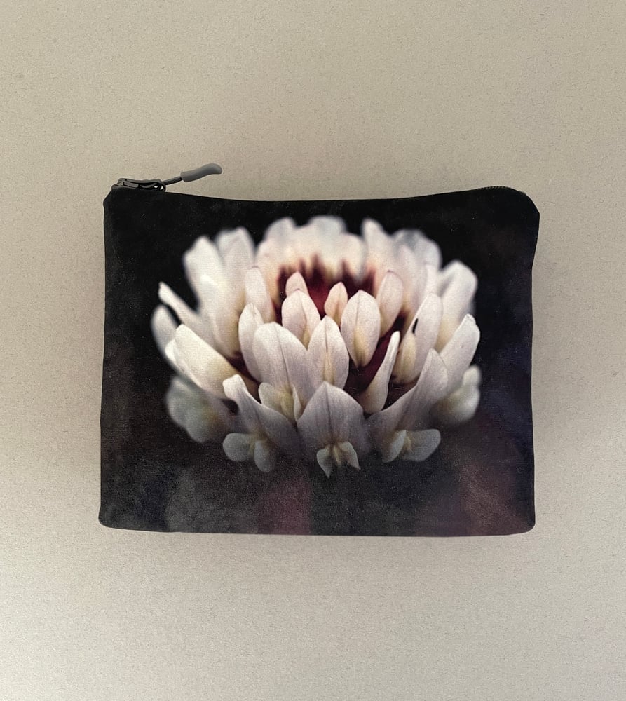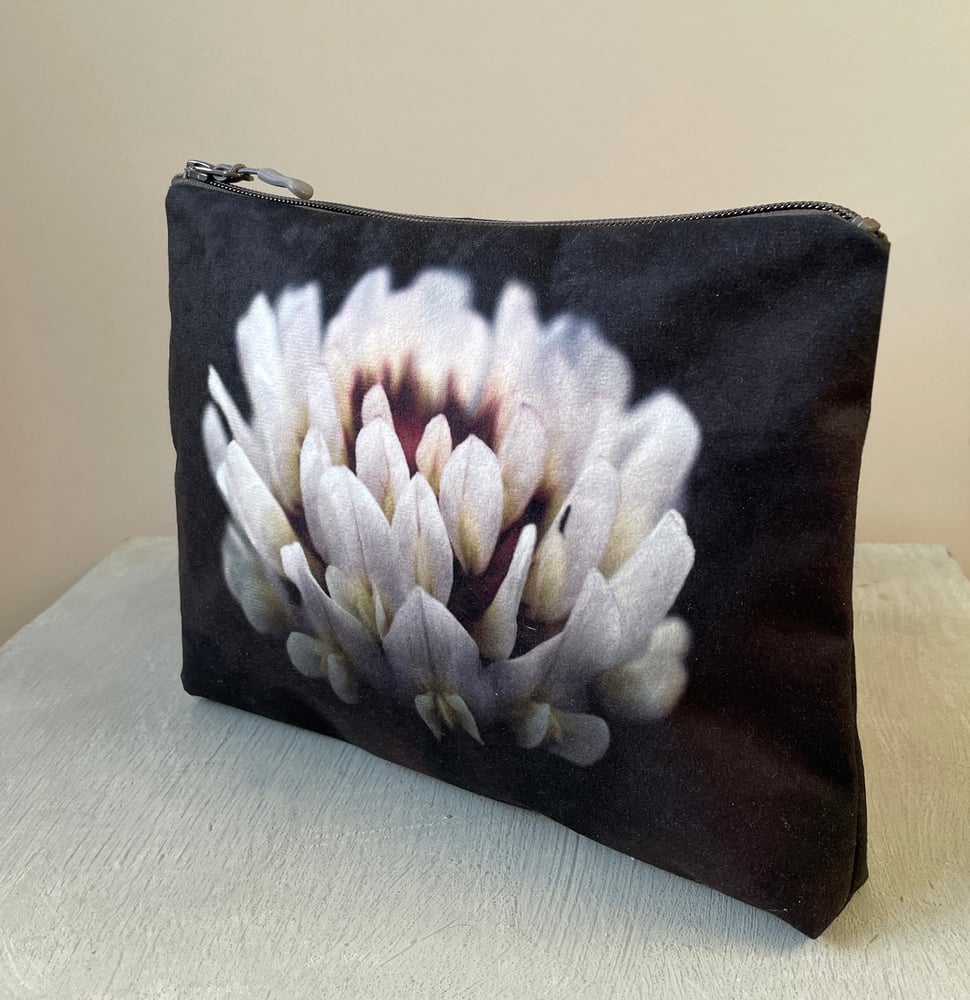 This large zipper pouch features an image of a clover flower on both sides, printed on waterproof brushed polyester with a soft flocked finish. Lined with water resistant poly-cotton for convenient storage of toiletries. Lightweight for travelling.