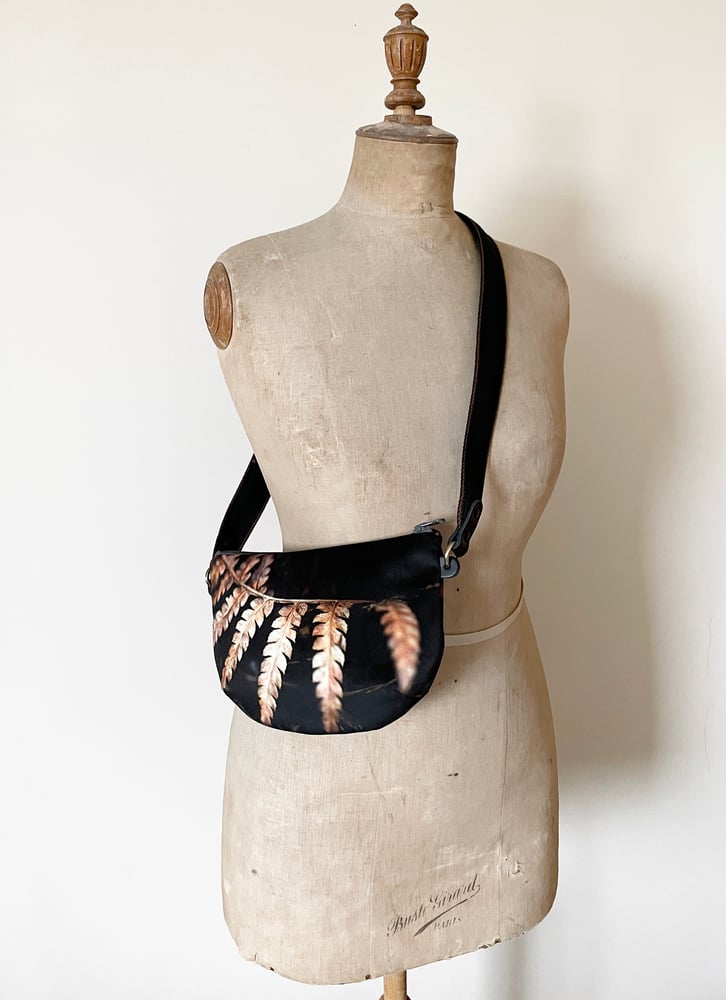 This crossbody shoulder bag has a velvety finish with a golden fern frond print and is sturdily handmade for everyday wear.