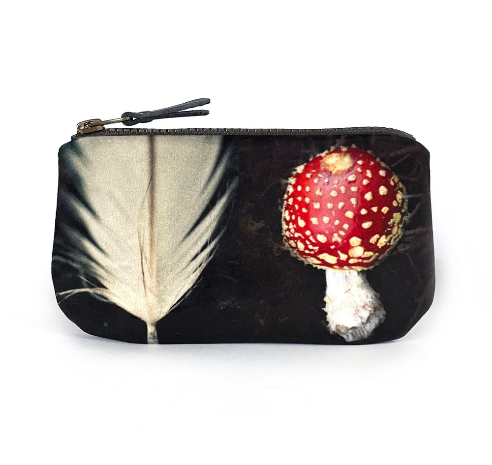 The fly agaric, a beloved and mysterious icon of folk tales through the ages. Pictured here on both sides of this velvety kisslock purse alongside a beachcombed feather. Perfect for carrying small treasures such as jewellery, ear buds, keys etc. Also fits cards vertically.