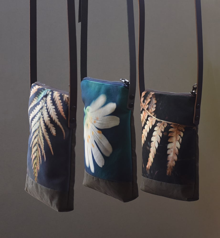 Golden fern frond, crossbody velvet and waxed canvas phone bag