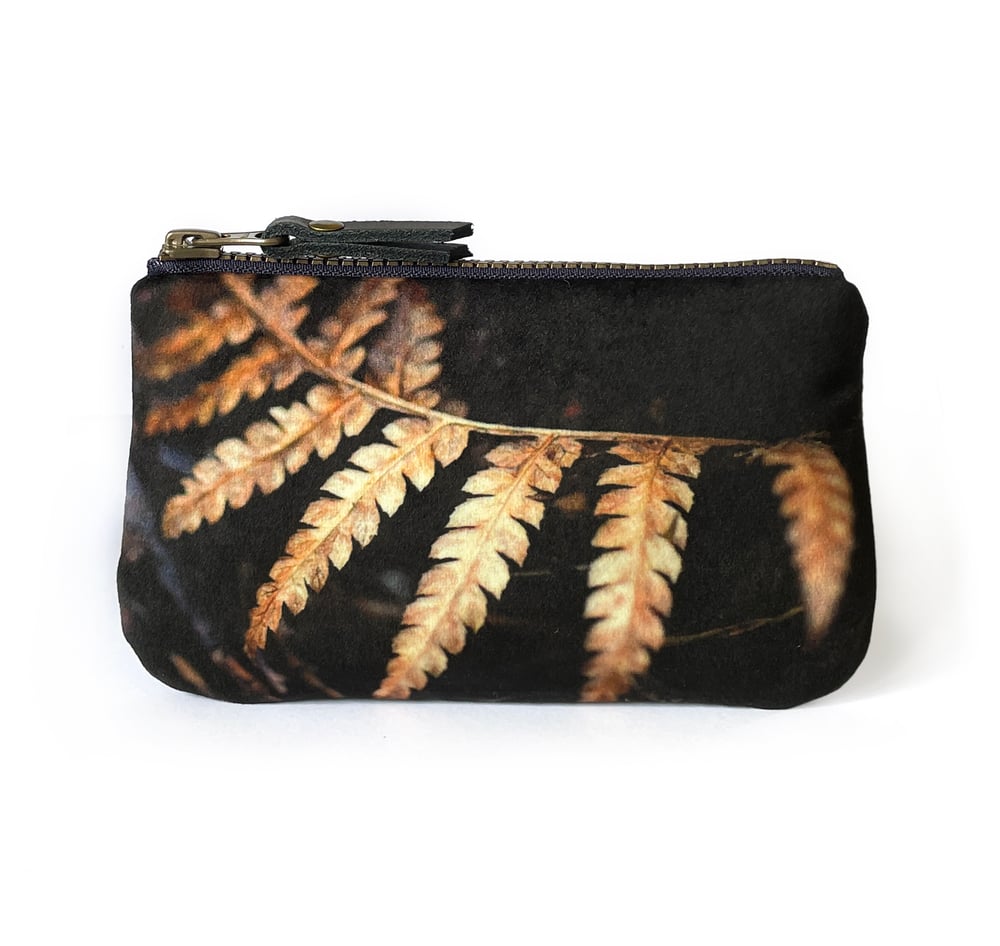 A golden fern frond print features on both sides of this velvet zipper purse. Large enough for coins, cards, glasses, keys - those smaller everyday treasures.