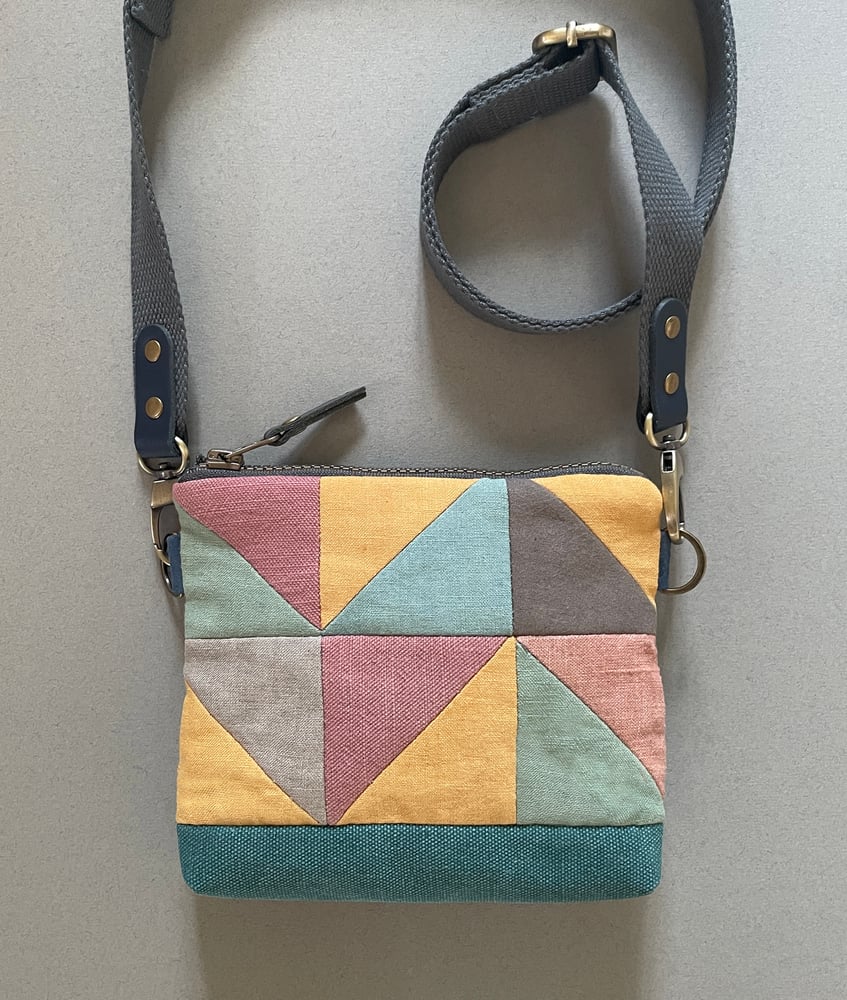 Meadowsweet triangle, mini patchwork shoulder bag with plant-dyed panels and crossbody strap