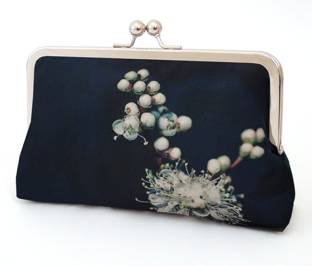 White meadowsweet blossoms feature on this printed fabric clutch bag, against a navy blue background. Lined with dupion silk and topped with an optional silver kisslock purse frame + chain handle. Presented in a quality keepsake Red Ruby Rose gift box, making it perfect as an accessory for a wedding or celebration, for luxurious gift-giving or keeping all to yourself.