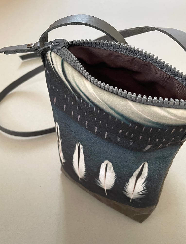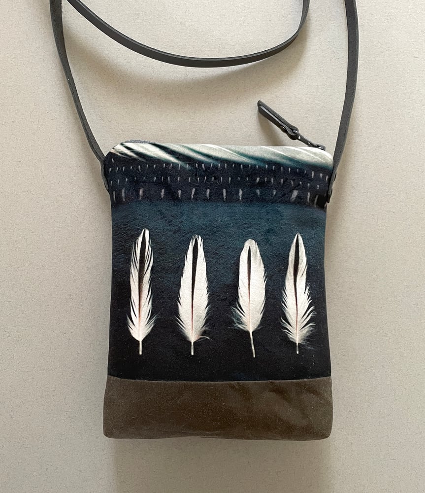 Oystercatcher feathers, crossbody velvet and waxed canvas phone bag