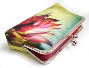 A pink astrantia flower features on this silk clutch bag, with adupion silk lining and topped with a silver kisslock purse frame + chain handle. Presented in a quality keepsake Red Ruby Rose gift box for luxurious gift-giving or keeping all to yourself.