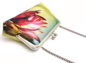 Astrantia pink flower, printed silk clutch bag + chain handle