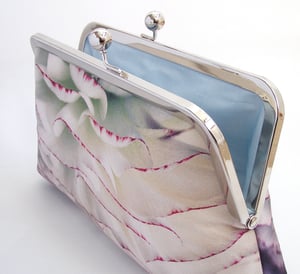 Pastel petals feature on this delicate clutch purse, printed onto silk georgette. The purse is lined with blue silk for a little extra luxury and topped with a silver kisslock frame + chain handle.