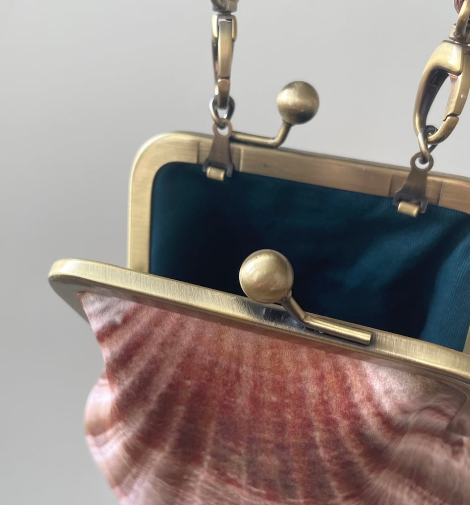 A seashell print features on both sides of this velvety shoulder bag. Lined with cotton and topped with a leather strap. Roomy enough for phone, keys and other everyday treasures. Strap is removable and the frame loops drop down into bag when not in use.