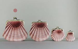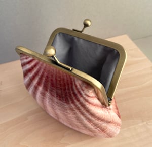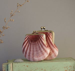 A seashell print features on both sides of this velvet coin purse. Lined with cotton and topped with an antiqued brass frame. Roomy enough for cards, keys and medium sized treasures.