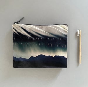 This large zipper pouch features an image of a white feather detail and the Torridon mountains on both sides, printed on waterproof brushed polyester with a soft flocked finish. Lined with waterproof poly-cotton for convenient storage of toiletries. Lightweight for travelling.