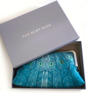 A pretty teal peacock print features on this silk clutch bag, with a dupion silk lining for a little luxury every time it is opened.