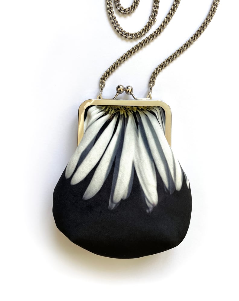 White daisy petals feature on both sides of this velvety shoulder bag. Lined with cotton and topped with a silver frame. Roomy enough for phone, keys and other everyday treasures. Chain is removable and frame loops drop down into bag when not in use.