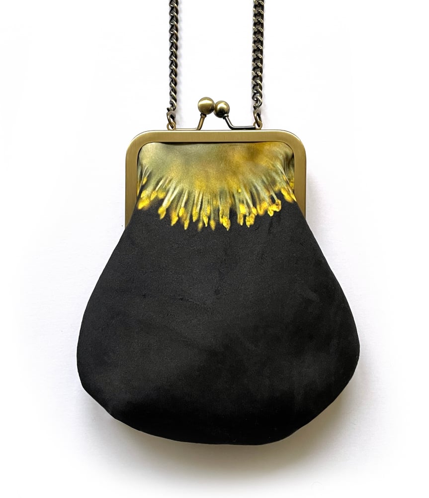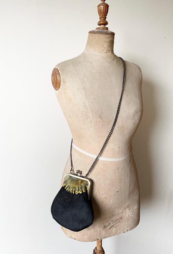 A yellow catkin features on both sides of this velvety shoulder bag. Lined with cotton and topped with a brass frame. Roomy enough for phone, keys and other everyday treasures. Chain is removable and frame loops drop down into bag when not in use.